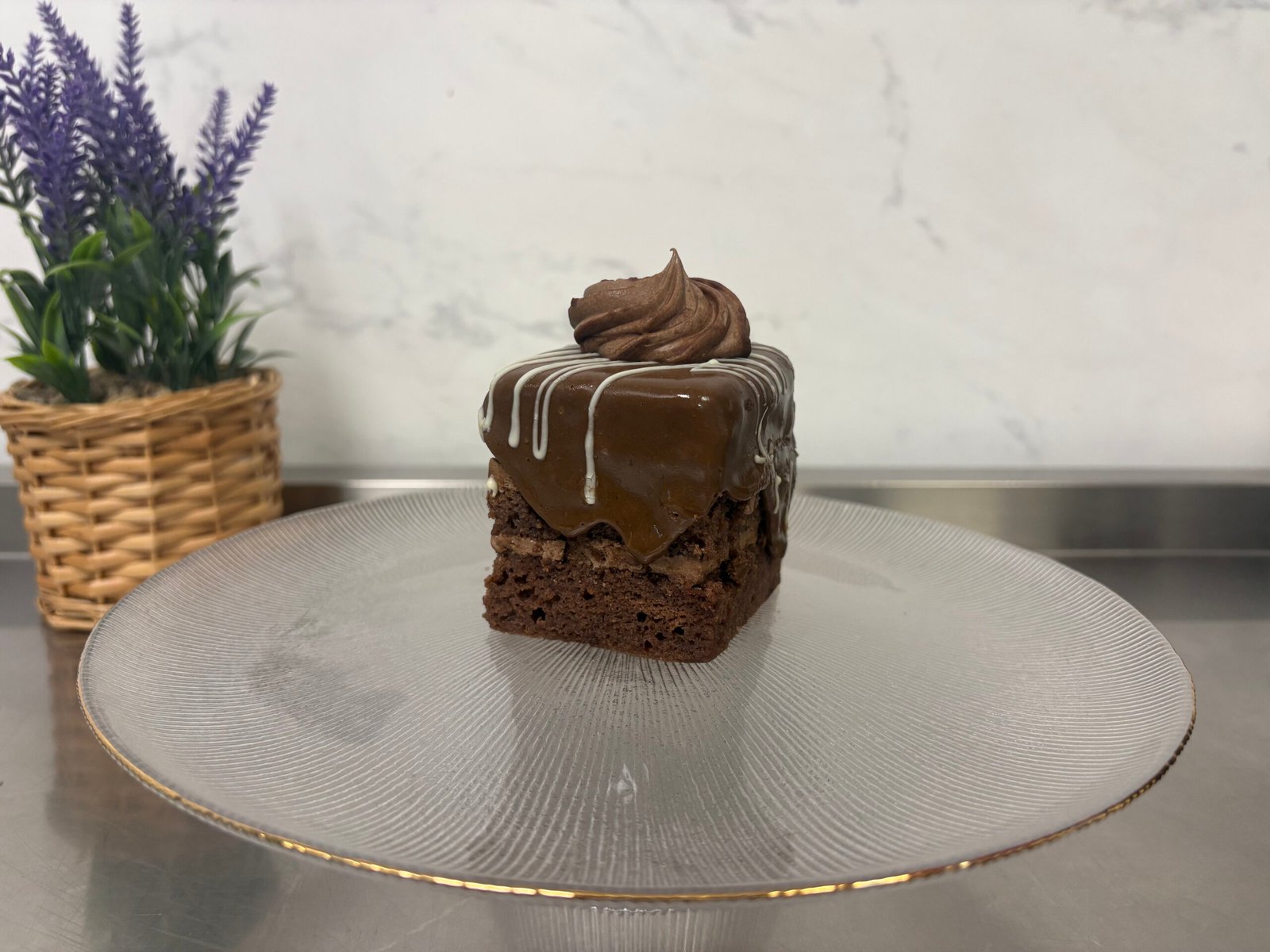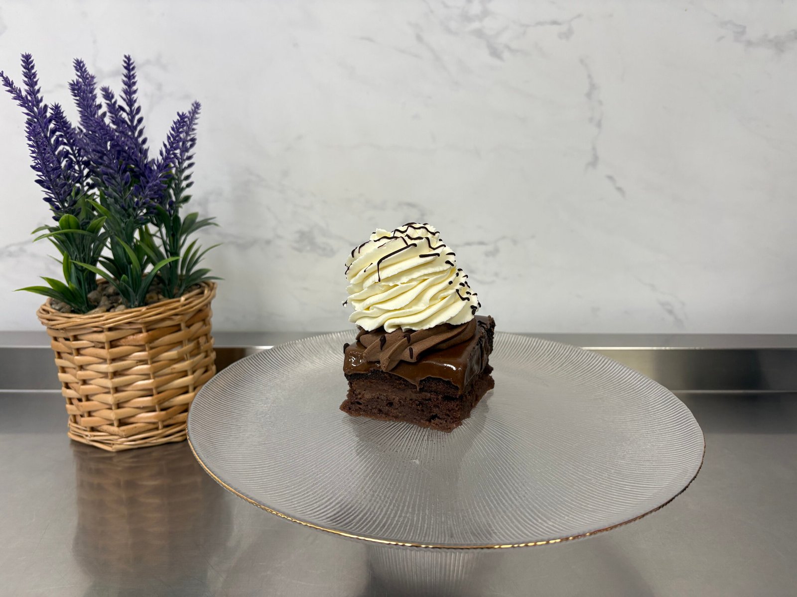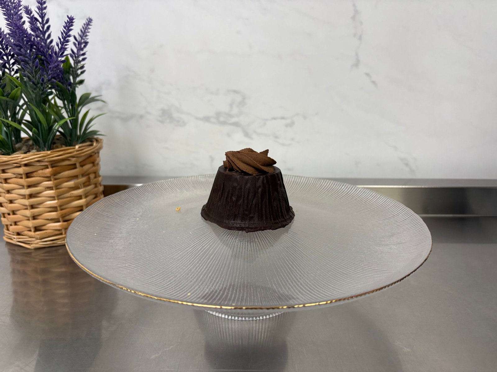 Blat umed de cacao, mousse de ciocolata cu lapte si neagra, choux-uri umplute cu crema de vanilie.