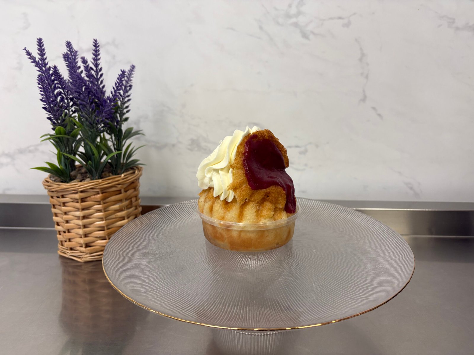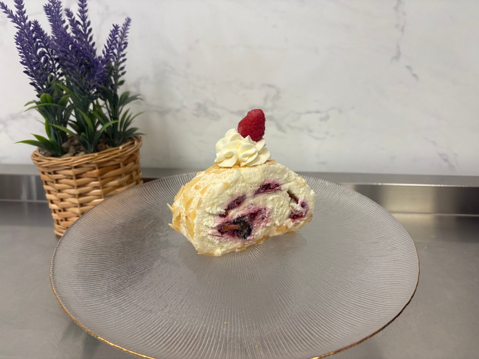 Foaie de bezea cu fulgi de migdale, confit de zmeura, crema de mascarpone cu frisca, fructe naturale de padure.