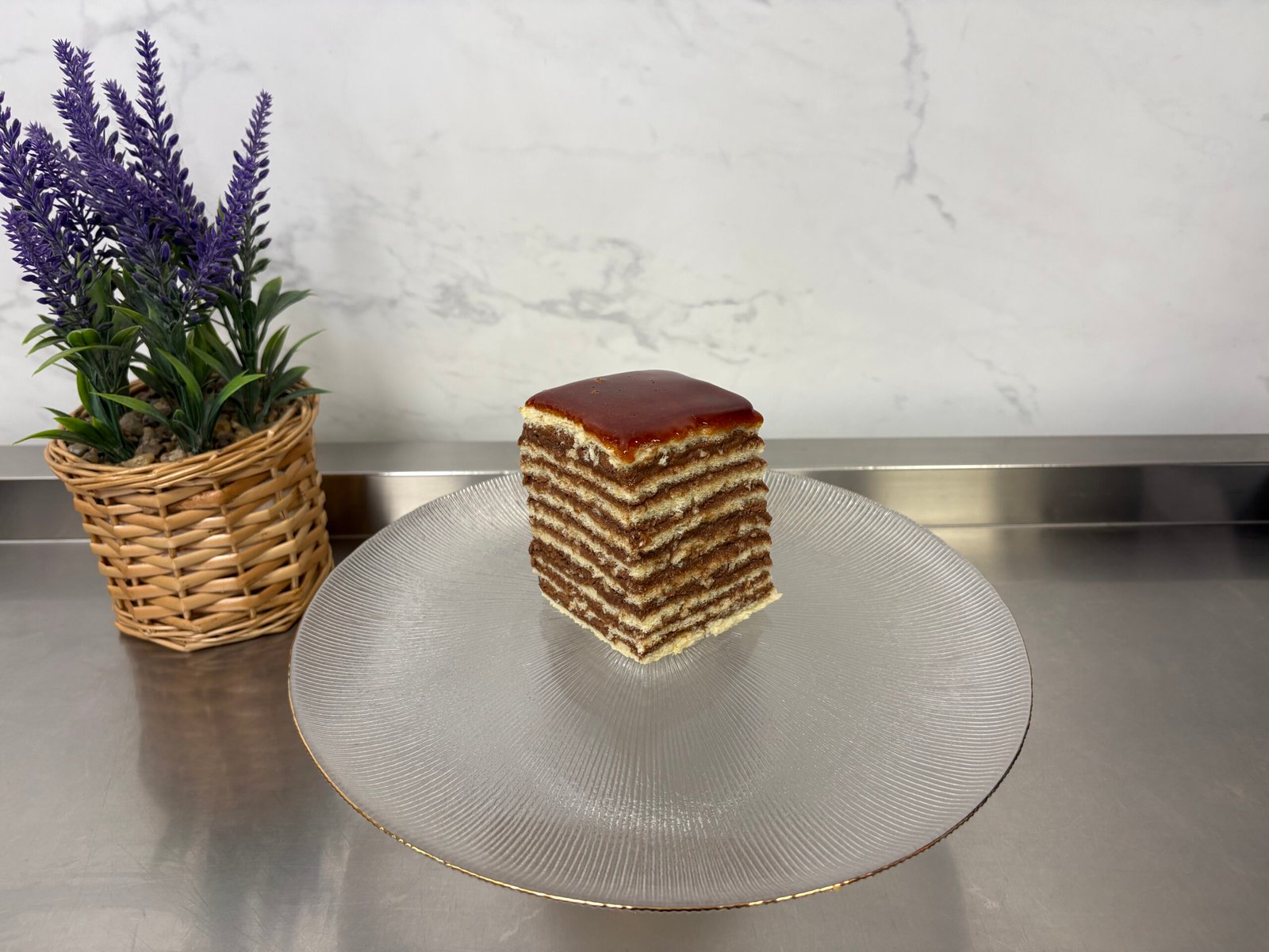 Foi de pandispan cu vanilie, crema de ciocolata cu rom, ou si unt, zahar caramelizat