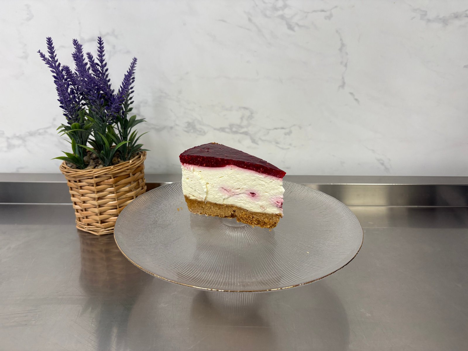 Blat vanilie cu făină de migdale – la alegere, fără gluten – mousse de fistic cu fructe de zmeură, insertie de ciocolata si zmeura