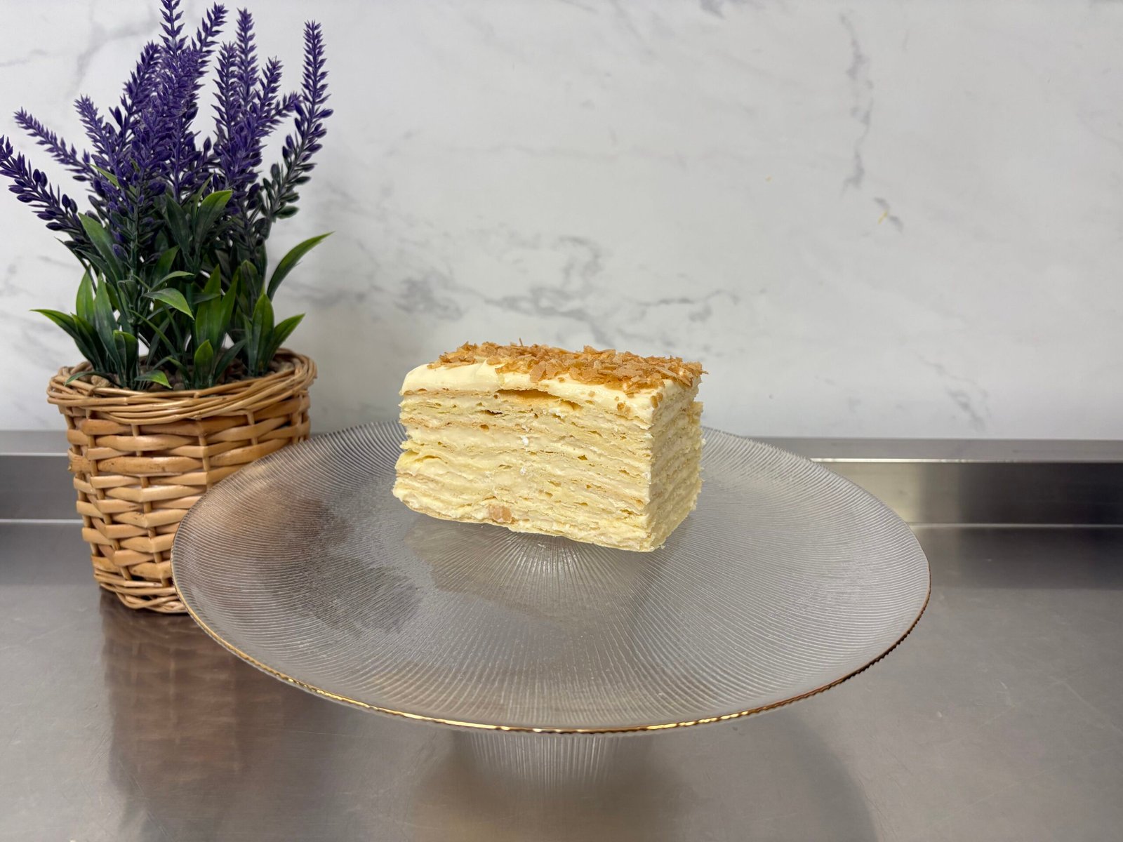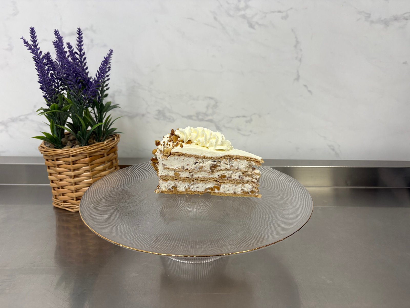 Foi de bezea cu nuca, crema de vanilie cu mascarpone, nuca caramelizata