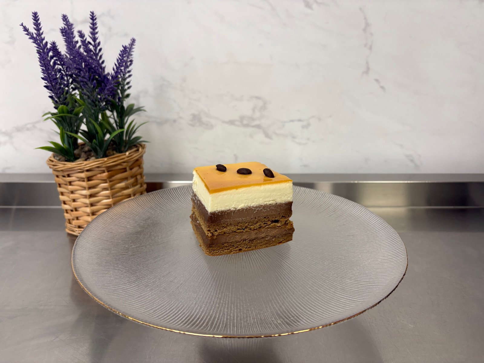 Foi cu fistic si faina de migdale, crema de mango, crema de fructul pasiunii, mousse de cocos si ciocolata alba