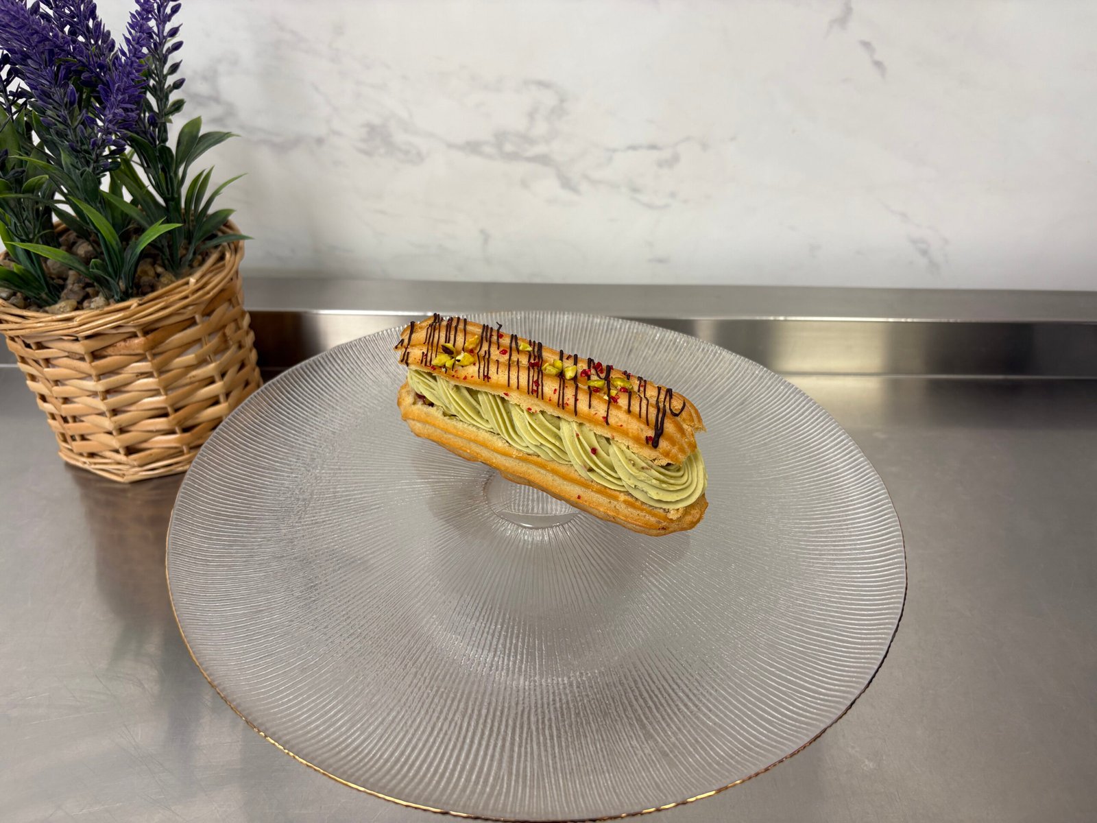 Blat bezea cu fistic marunțit, insertie crocanta de biscuite franțuzesc paillete feuilletine cu pasta de fistic, mousse de lime cu fructe de zmeura