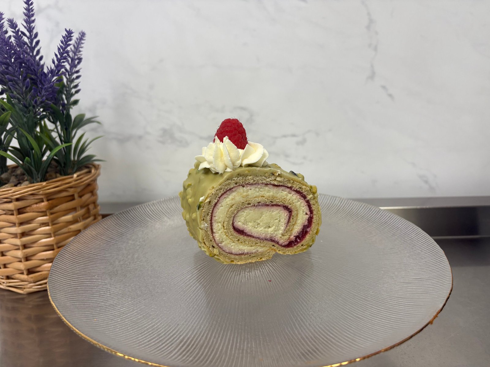 Foaie de rulada cu fistic, confit de zmeura, ganache de fistic cu ciocolata alba