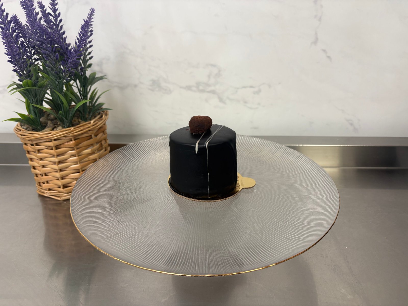 Blat vanilie cu faina de migdale, mousse de cafea, insertii de vanilie si ciocolata, trufe de ciocoalata neagra cu whiskey